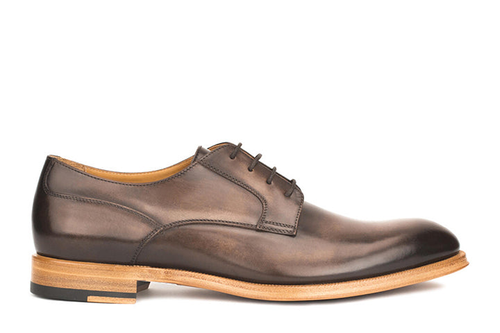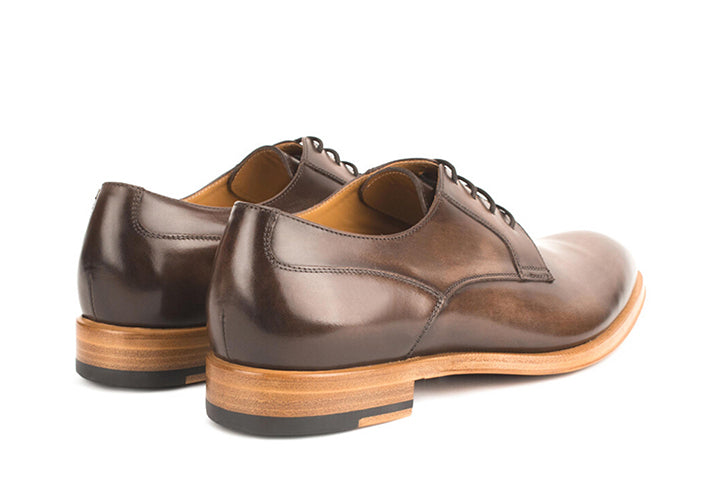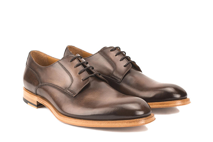 A chisel-toe blucher mounted on a single leather sole. This shoe is crafted in Italy, and the upper is cut from premium, hand-burnished Italian calf leather. The natural sole is critical here because it takes the serious edge off of an ‘all-business’ shoe, while the semi-brogue detail at the quarter panel breaks up the composition. This is a work-horse business style—a shoe you can wear comfortably with a suit, 5 days a week. When it’s time to get them re-soled, the Blake-stitch construction makes the job easy for your cobblers